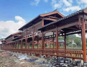 這個項目是湖北黃崗市的一個村里,定制的是一套古建小青瓦防腐木長廊,尺寸是長度11米,寬度為2.8米,總面積為30個平方米左右。陳總在網上找到我們